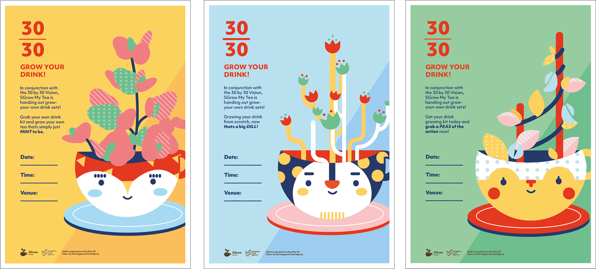 The key visuals will be 3 teacup characters what will appeal to a younger audience. The posters will be used for vendors to indicate the date, time and place of the distribution of tea sets. Each poster has a fun pun about the 3 flavours of tea they can try growing, to appeal to the young demographic.