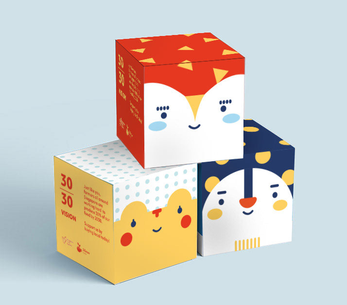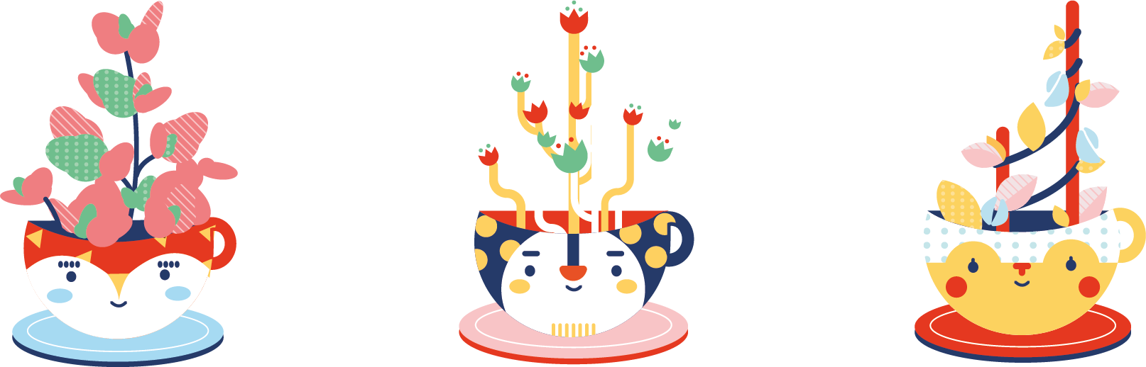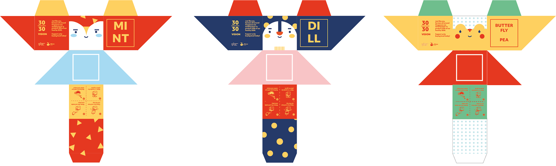The packaging for the tea plants are designed based off the 3 characters, they are made to resemble colourful toy building blocks to appeal to children.